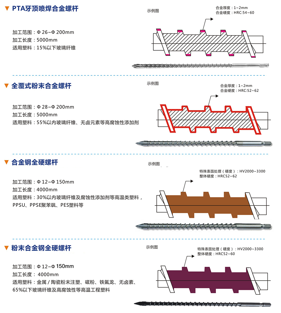 經過23年在塑機行業的沉淀,我們發現在塑料制品成型中塑化組件是最容易出現問題的,經常碰到“痛點”。如:混色不均,重復精度低,過膠頭易斷、防火劑塑化不良,透明產品發黃、黑點,料管易開裂,螺桿料筒不耐高溫、不耐高壓,被磨損、被腐蝕等等。公司于2011年引進核心人才,自主研發合金新材料,購買高端設備,經過幾年的不斷試制,成功解決了這些痛點。并用工匠精神精益生產為客戶定制塑料機械核心零部件--機筒螺桿塑化組件。